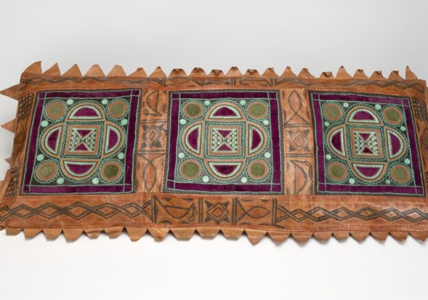 Among the highlights is a century-old saddlebag, its geometric cut-outs revealing delicate layers of colour beneath, a manuscript cover that echoes the abstract forms and geometric symmetry of Islamic art, and a cushion case dyed in vivid shades using pigments made from local plants and minerals. Even a pair of riding boots, stored flat for more than a century, has been carefully restored to its original shape and finish.