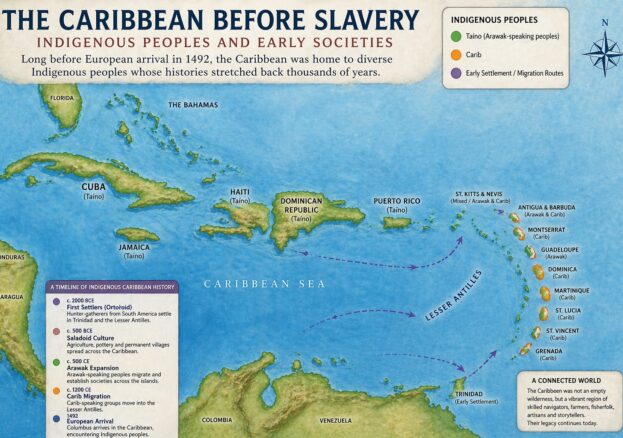 Understanding who lived in the Caribbean before slavery means tracing a long story of movement — from the first settlers to the complex societies encountered by Europeans.